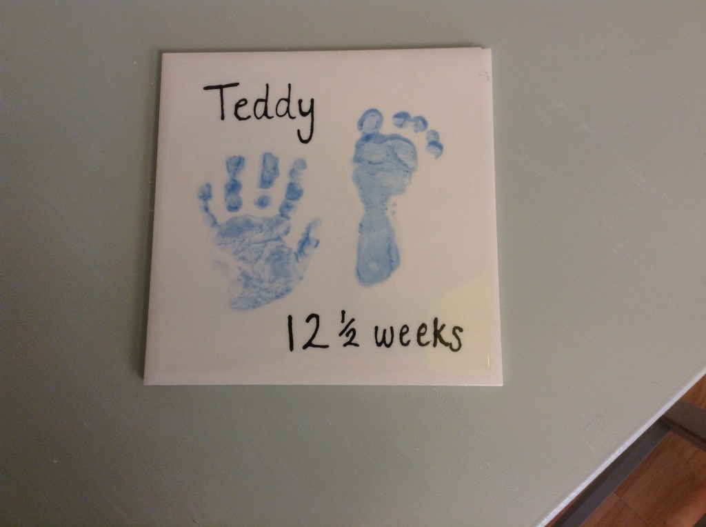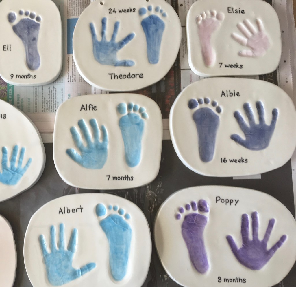We take an imprint of your child’s hand/foot into soft clay. The imprint is then dried before being kiln fired. It will then be glazed and fired again to complete.